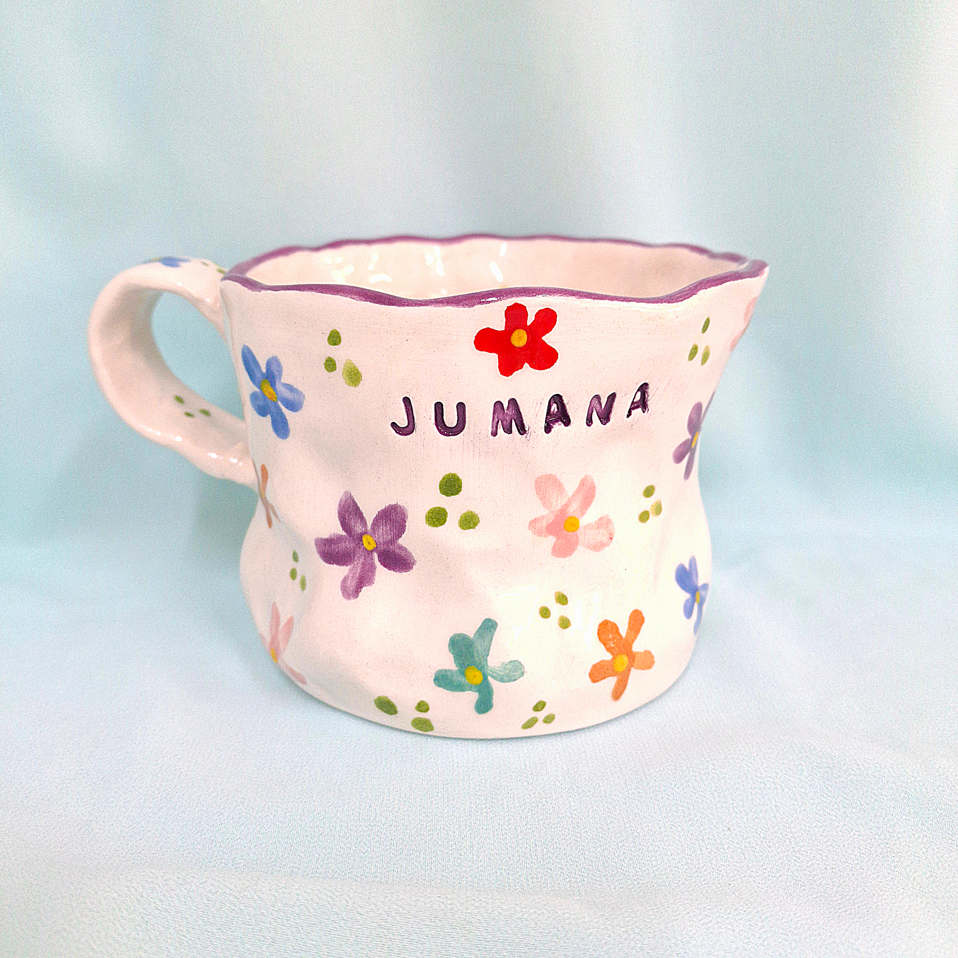 Handmade Pottery Mug . Customized Name . Colorful Flowers . T