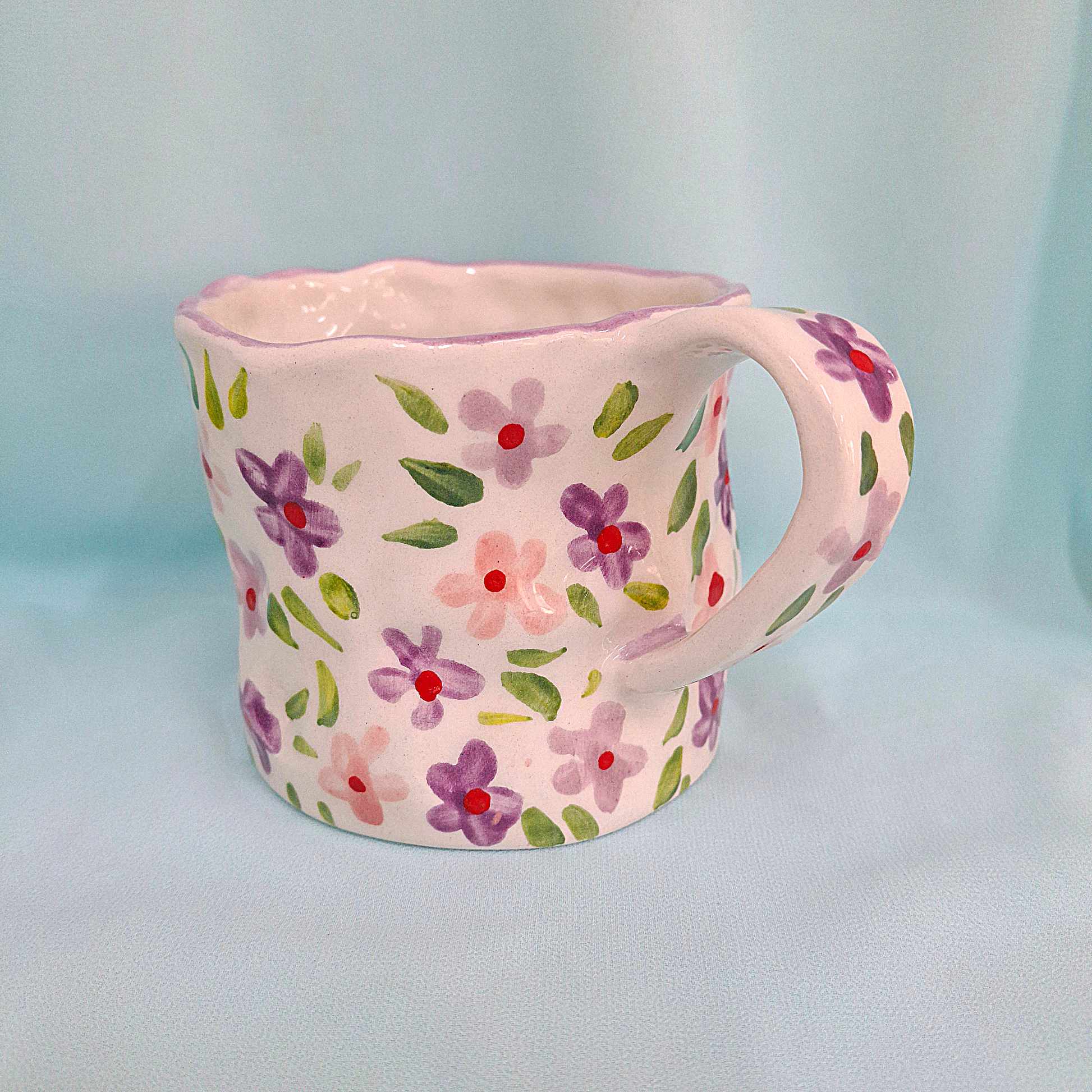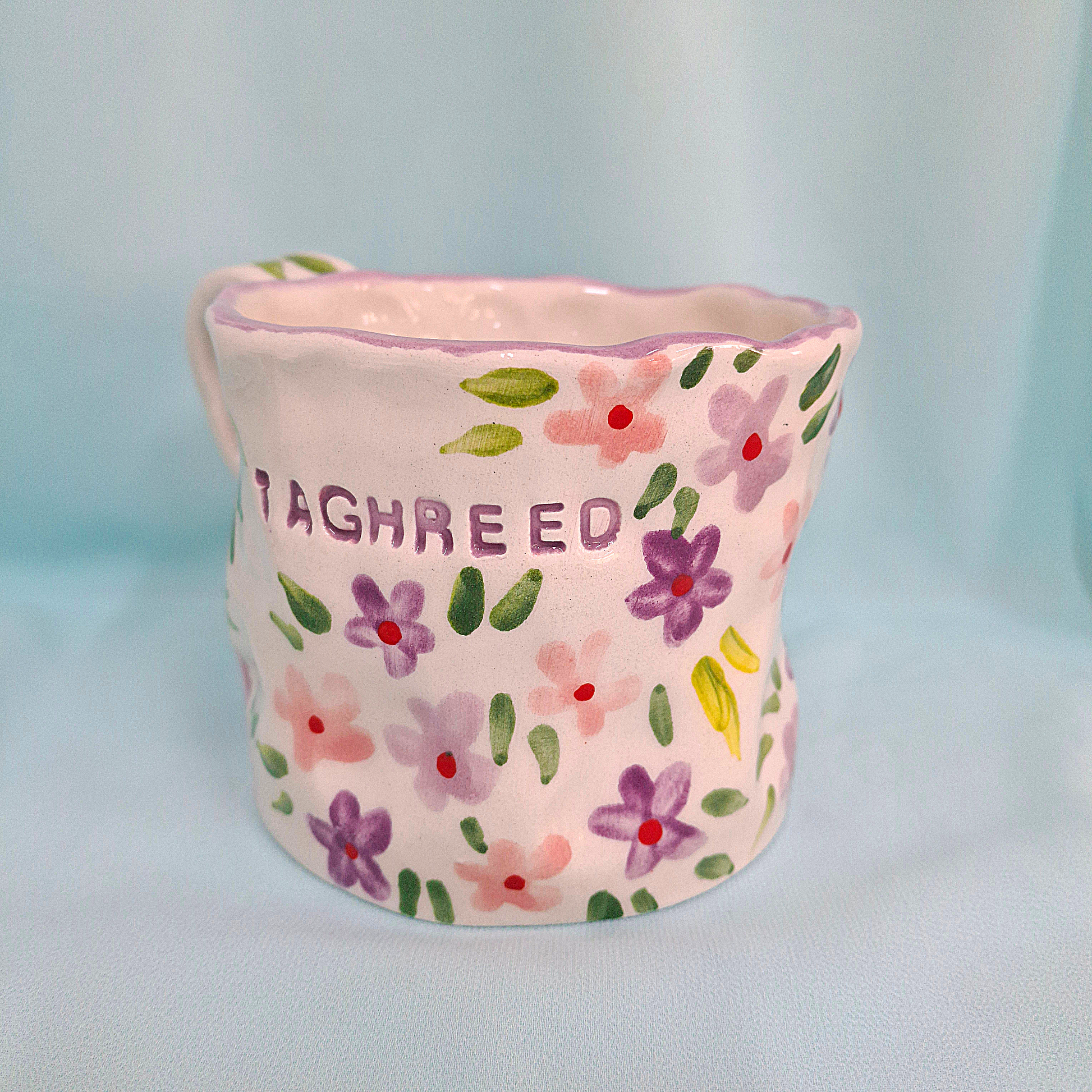 Handmade Pottery Mug . Customized Name. Purple & Pink Flowers